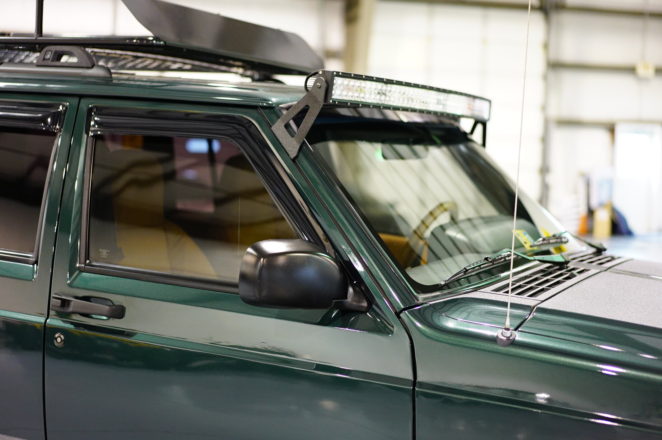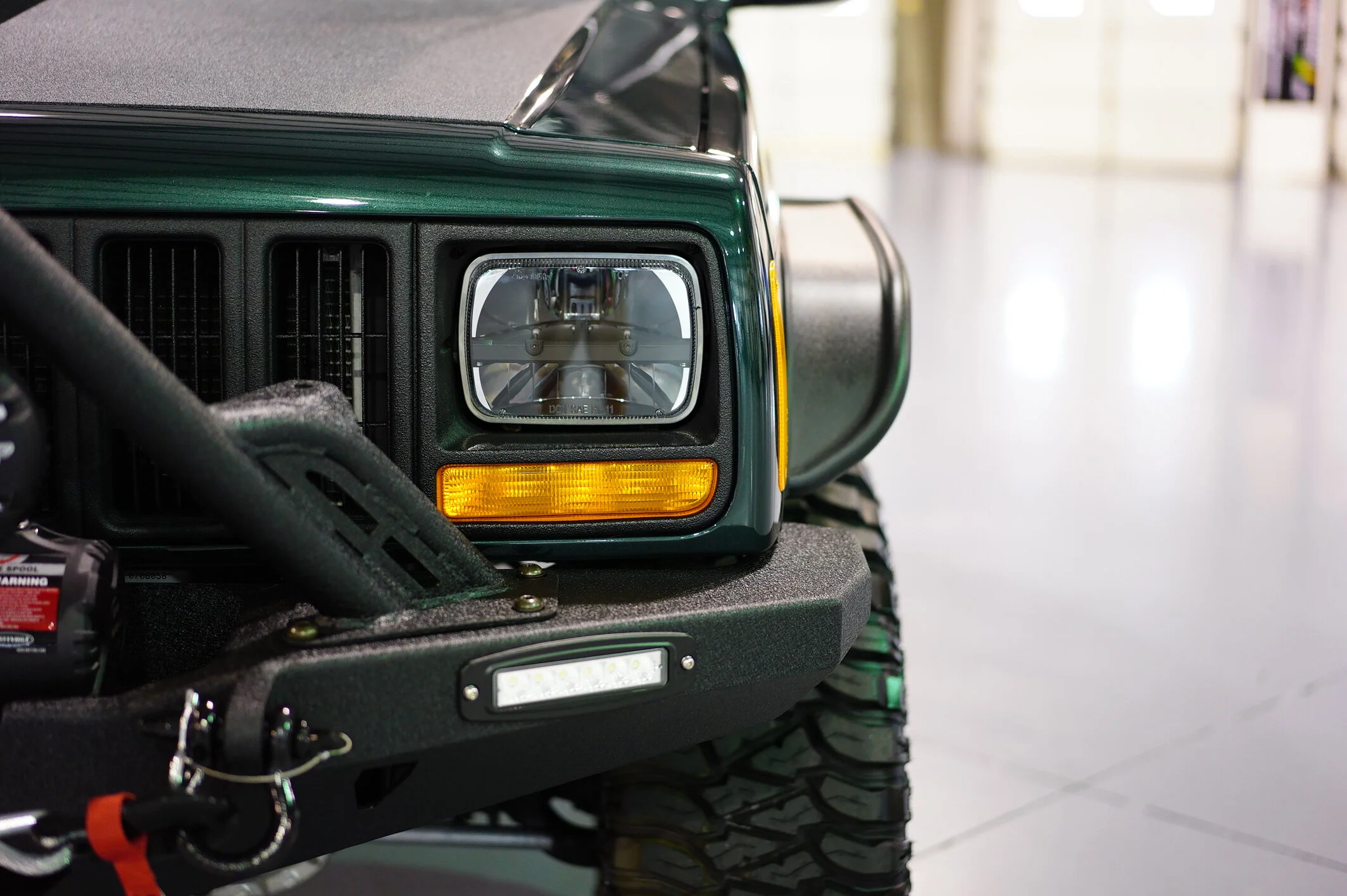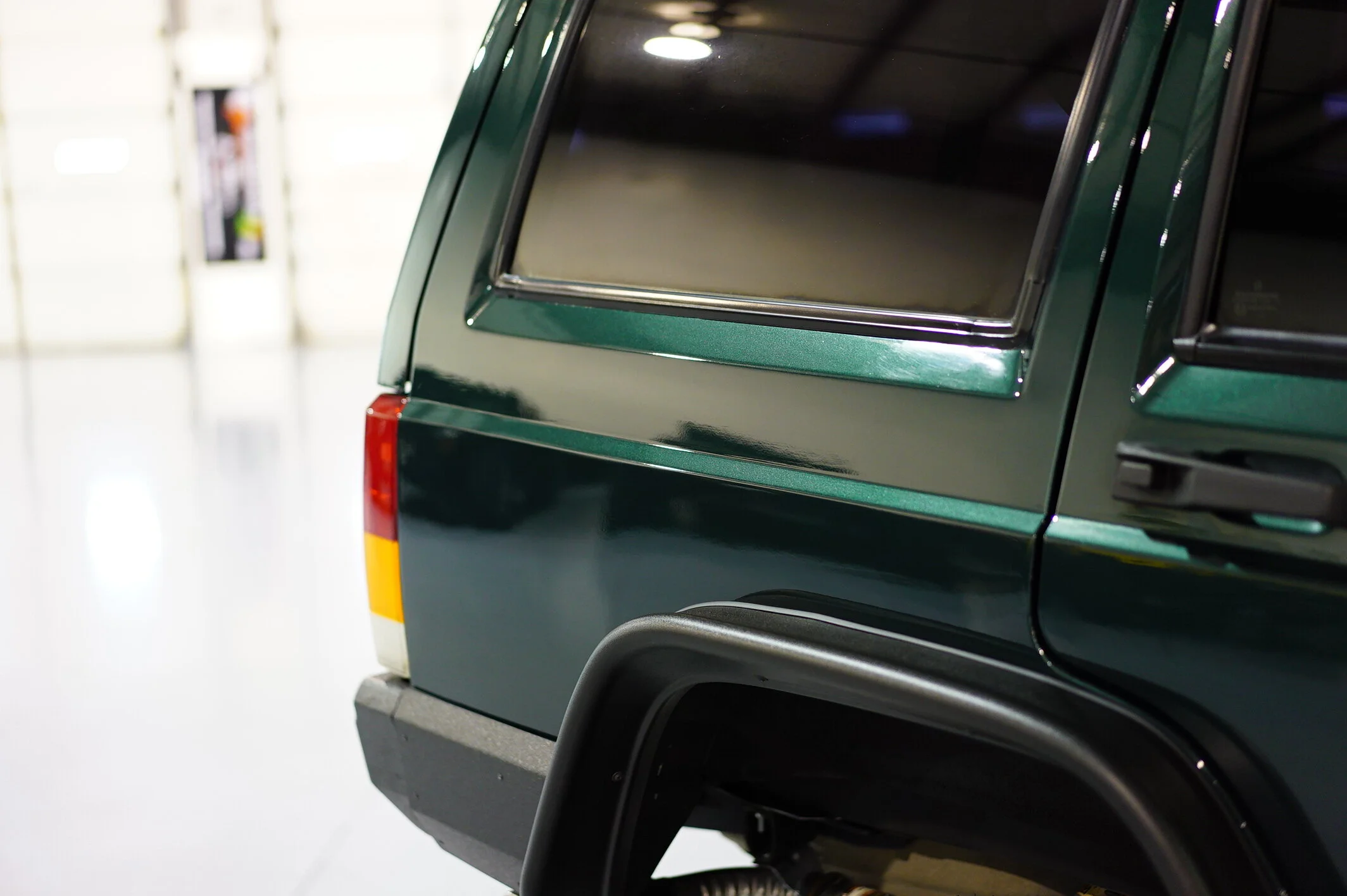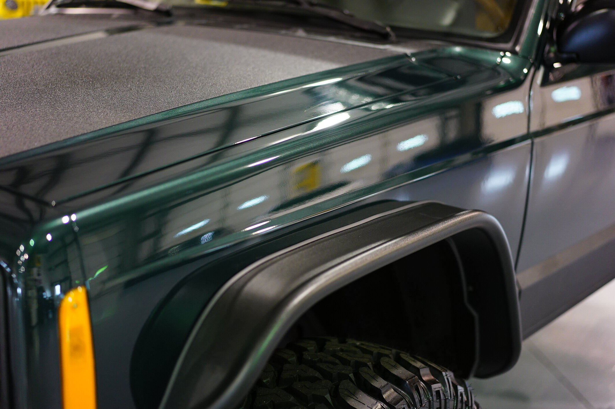 We sanded this body down and got our all previous imperfections, dings, and defects. We primed the entire vehicle, blocked down the primer and shot it with the factory color base coat. We then added 3 full layers to clear coat and wetsanded it down to give if a super smooth and finish. The clear is VERY DEEP and looks great in person. We have well over 50 hours alone in the paint and body work on this jeep.