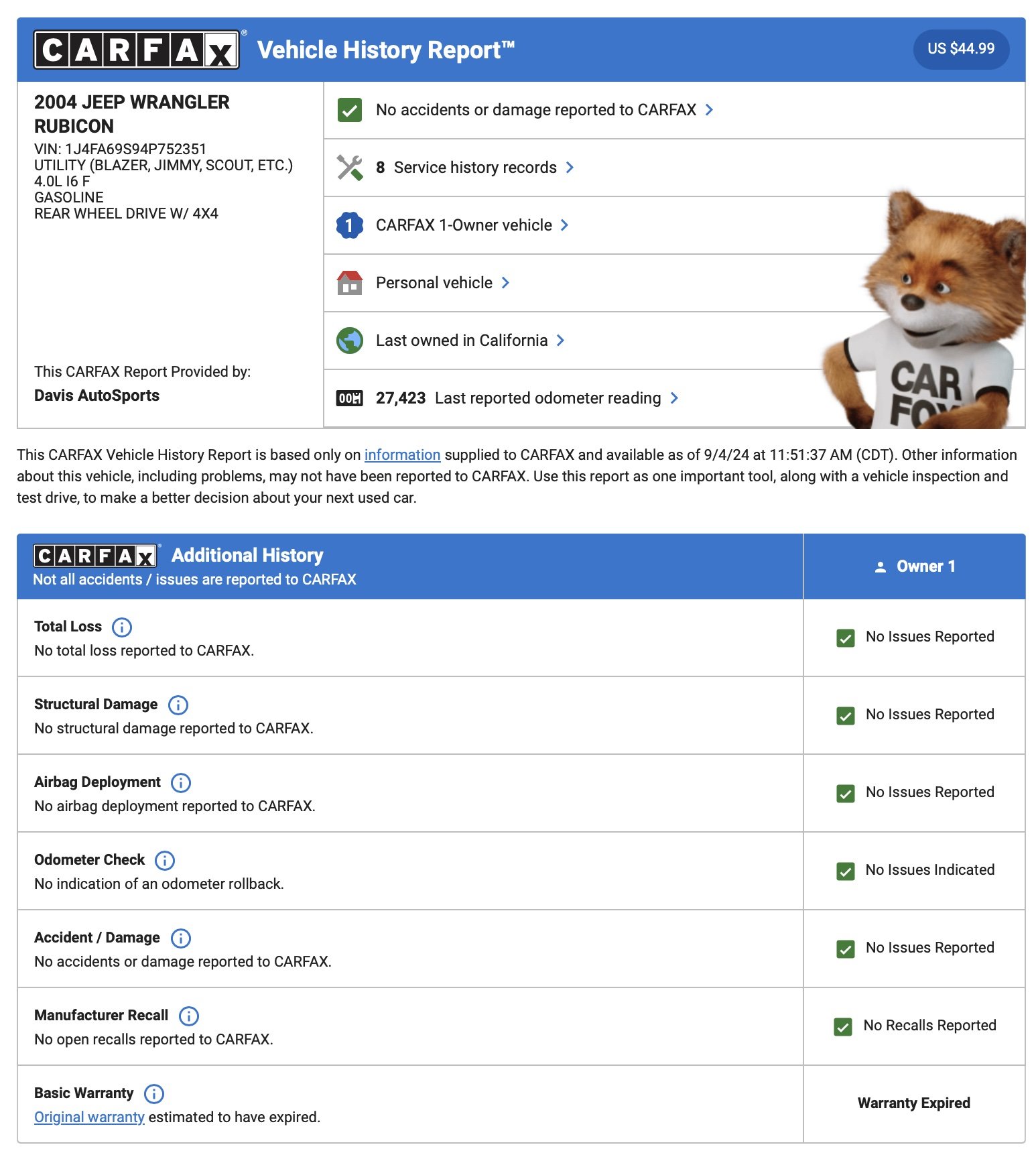 Up for sale is an absolutely gorgeous 2004 Jeep Wrangler TJ Rubicon with just 27k original and documented miles. This 1 OWNER Wrangler has been in California its entire life before we received it !!! You will not find another TJ like this one!!!!